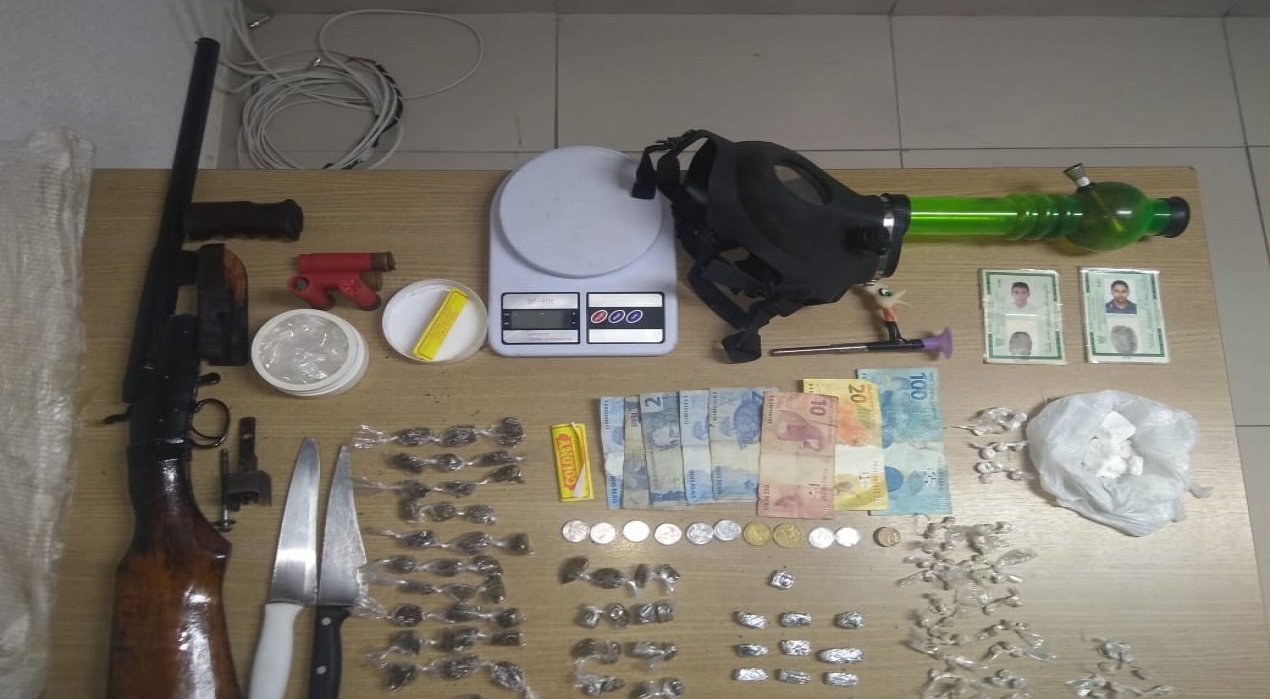 Os dois suspeitos, que têm 31 e 18 anos de idade, estavam com uma espingarda calibre 12 de fabricação caseira, munições, 71 pedras de substância semelhante ao crack, 66 papelotes de maconha e 30 gramas de cocaína. A dupla estava ainda com uma balança de precisão e dinheiro em um ponto de tráfico nas proximidades do Porto do Capim.