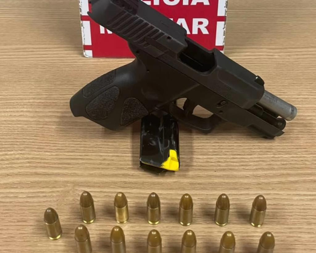 Após chegarem ao local da denúncia, os policiais da Força Tática do 7º BPM localizaram a mulher com vários hematomas no corpo e que relatou ter sido ameaçada, sofrido agressões físicas e tido seu aparelho celular quebrado pelo agressor. Ao avistar a guarnição, o suspeito rapidamente tentou esconder a arma de fogo dentro do veículo, mas não obteve êxito.