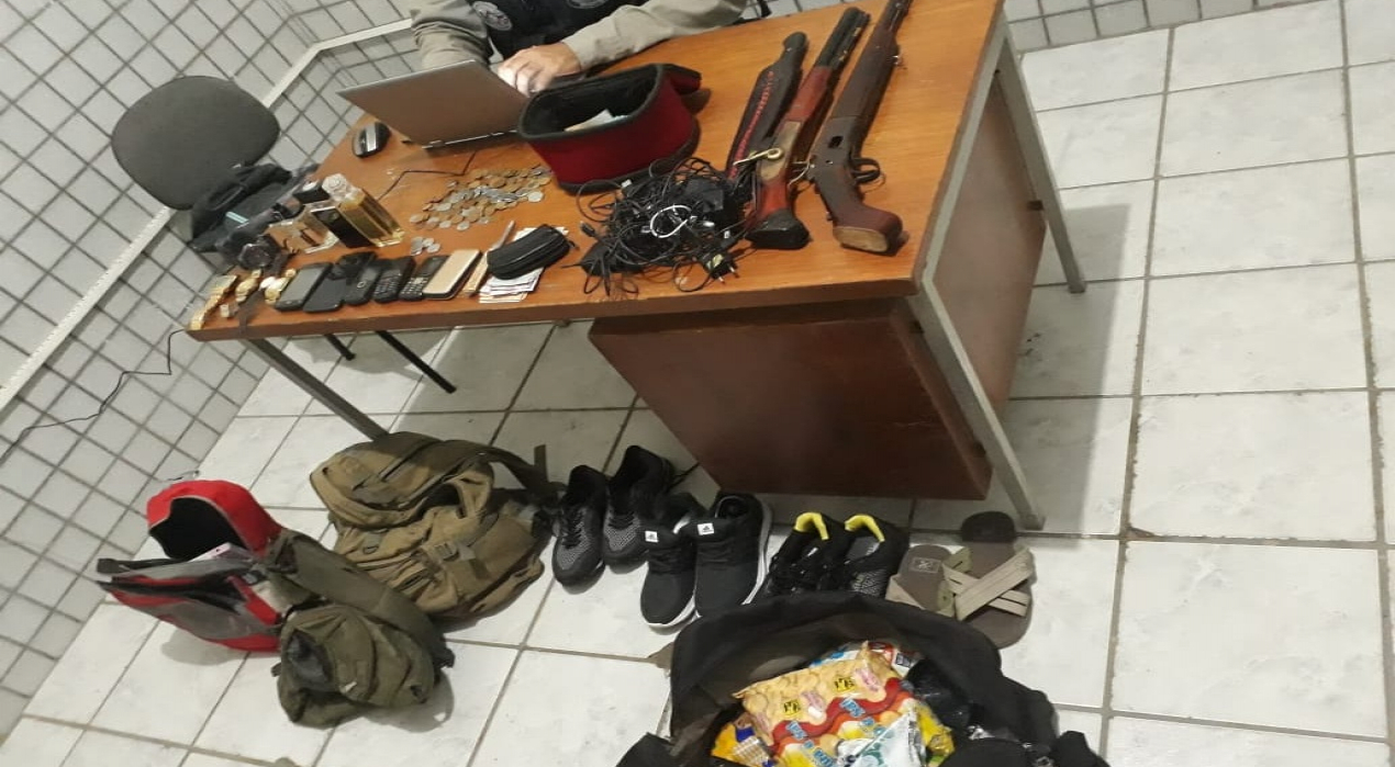 Com os acusados, de 18, 16 e 15 anos, a PM apreendeu duas armas de fogo e recuperou celulares, dinheiro, relógios, mochilas, tênis, sandálias, acessórios de maquiagens, caixas de sabonete, lanterna e até duas conchas de cozinha – todos produtos dos roubos praticados pelo trio na noite dessa sexta-feira.