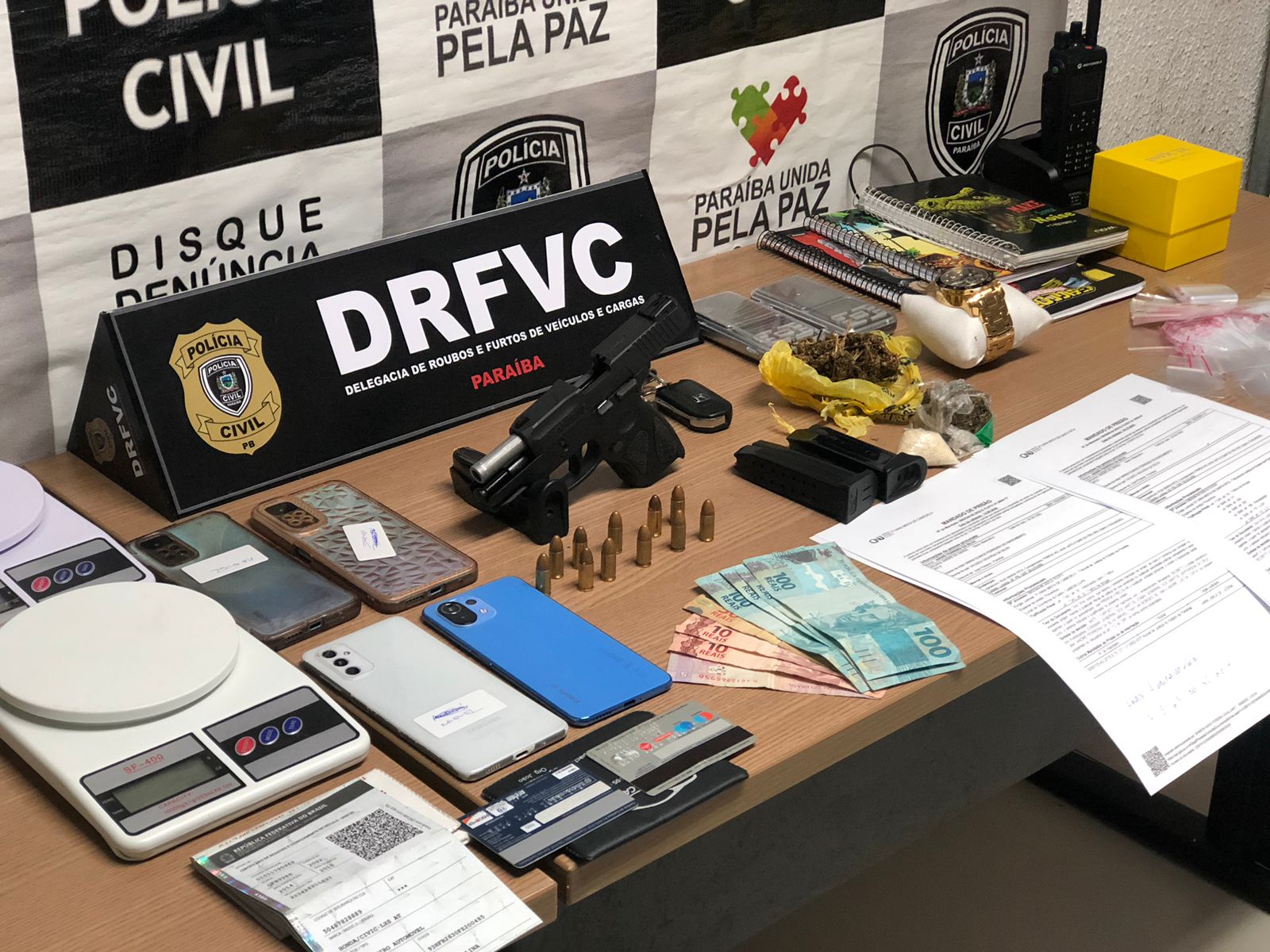 A Polícia Civil da Paraíba, através da Delegacia de Roubos e Furtos de Veículos e Cargas –DRFVC, com apoio da Polícia Rodoviária Federal – PRF e da 5ª Delegacia Seccional de Polícia Civil em Santa Rita, prendeu em flagrante, na manhã desta quinta-feira, 4, dois homens e uma mulher pelos crimes de tráfico de drogas, posse ou porte de arma de uso restrito por equiparação (numeração suprimida), associação criminosa e uso de documento falso.