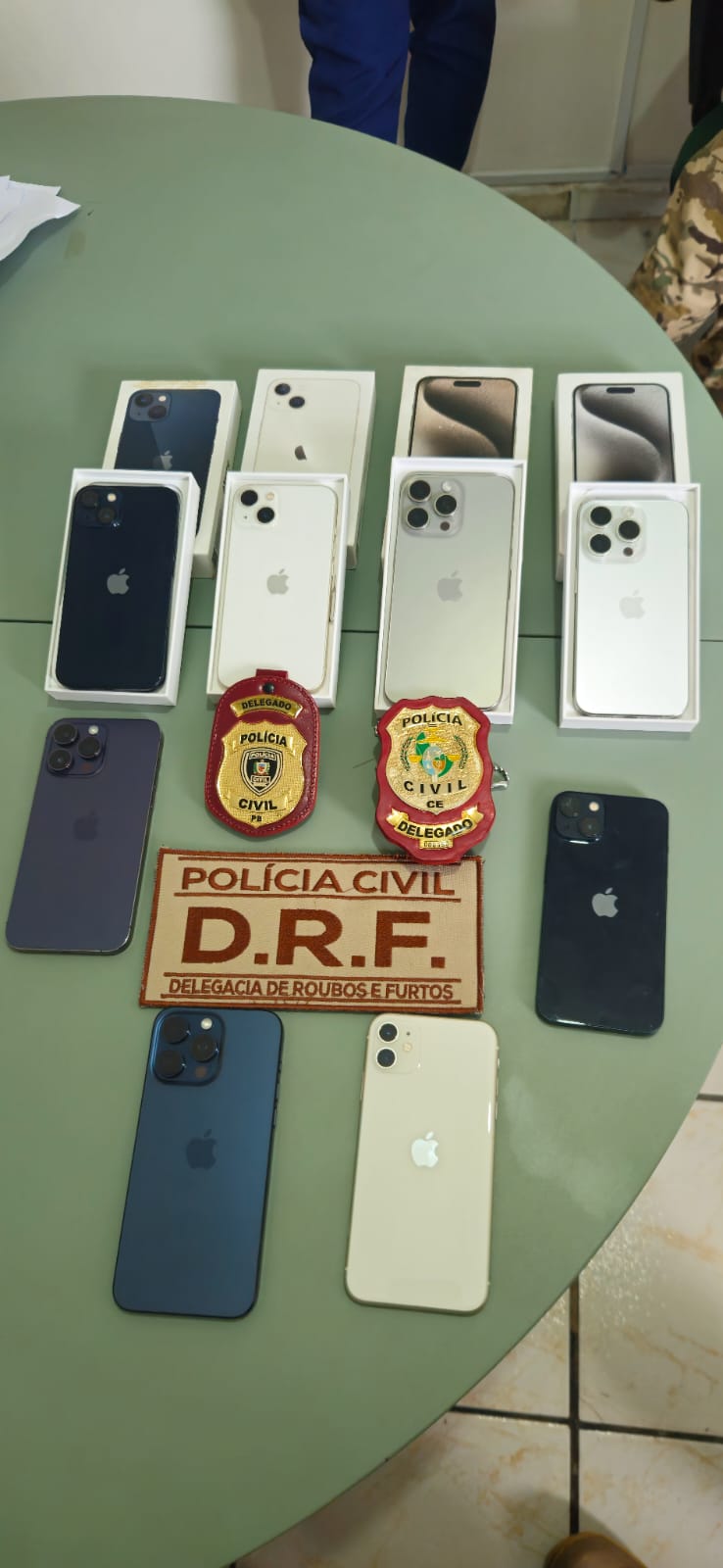 A Polícia Civil, por meio da Delegacia de Roubos e Furtos (DHE) de Patos, em parceria com a Delegacia de Penaforte, no Ceará, recuperou oito celulares furtados após ação investigativa realizada na manhã desta terça-feira (28). Suspeitos de furto e receptação foram presos e encaminhados à autoridade policial.
