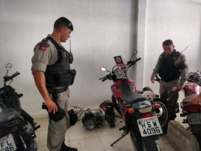 Com a dupla foi encontrada uma moto XRE Vermelha placa QFO 9095, com registro de roubo, peças de outras motos e uma moto tipo Tornado placa HSW 4096 modificada.