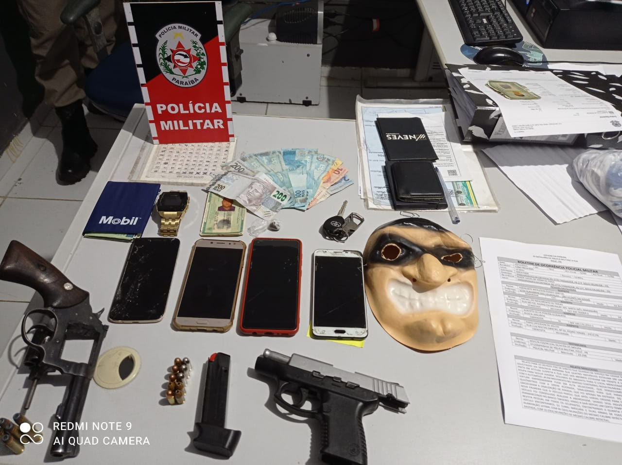 Durante a revista no carro foram encontradas duas armas de fogo sendo uma pistola calibre 380, um revólver calibre 38, mais 16 munições, quase mil reais em dinheiro, celulares e uma máscara.