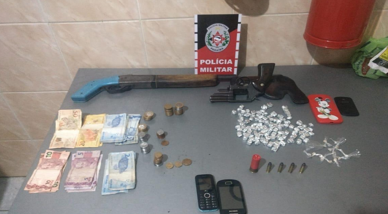 A Polícia Militar desarticulou um ponto de tráfico de drogas, apreendeu armas de fogo, munições e dinheiro no município de Alhandra, na madrugada desta terça-feira (12). Um homem de 21 anos foi preso e conduzido para a delegacia da cidade.