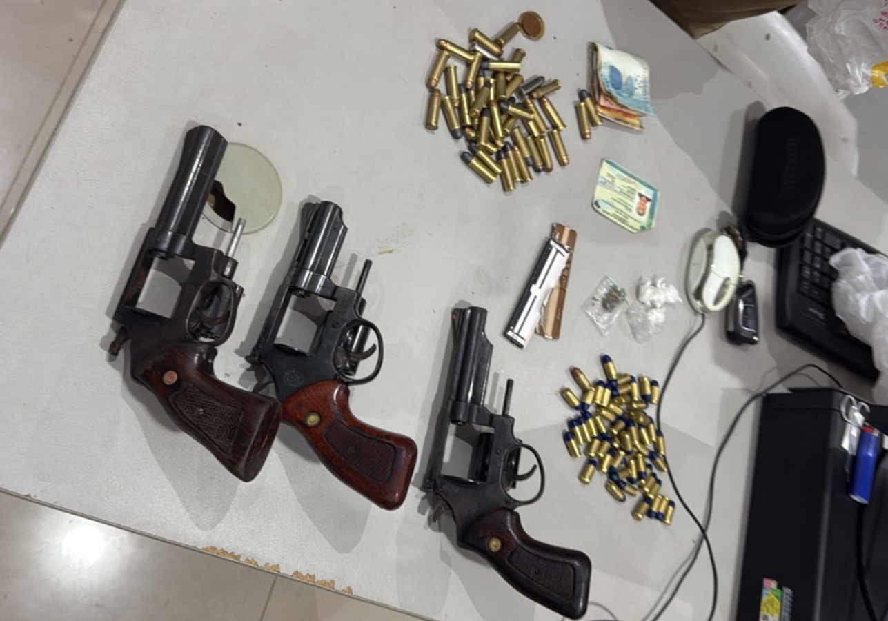 A ação foi realizada por equipes do 8º Batalhão, que reforçavam as rondas na região, quando interceptaram o carro onde os acusados estavam. Durante a abordagem, os policiais encontraram três armas de fogo e diversas munições.