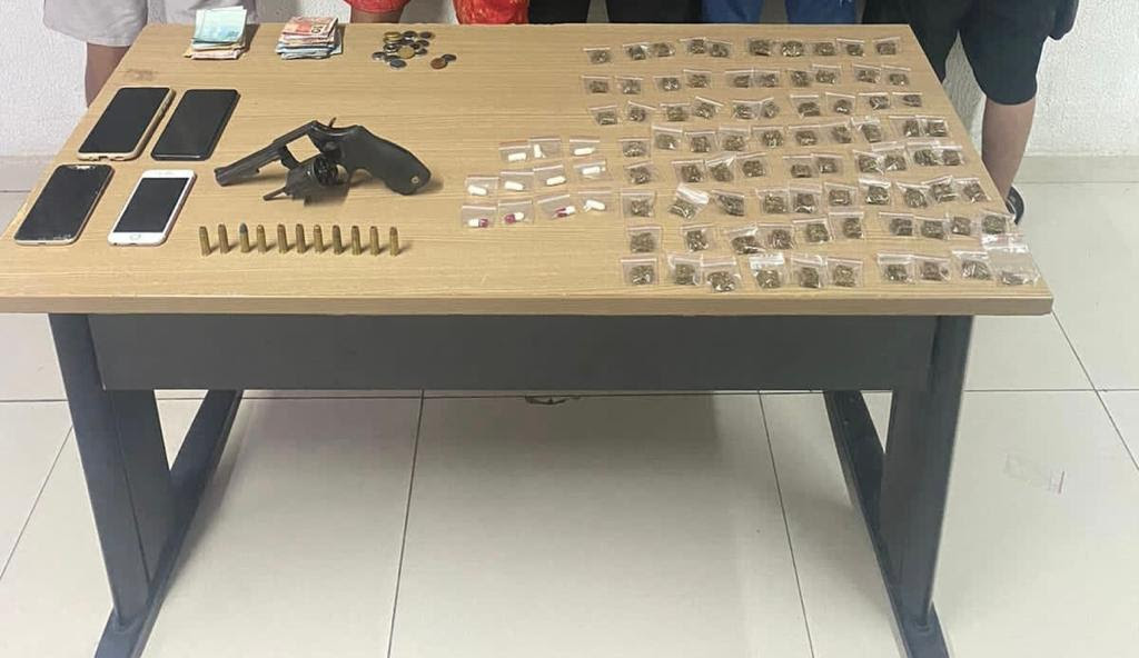 Com eles, foram apreendidos um revólver calibre .38, munições, quatro aparelhos celulares, dinheiro e drogas embaladas para venda.
