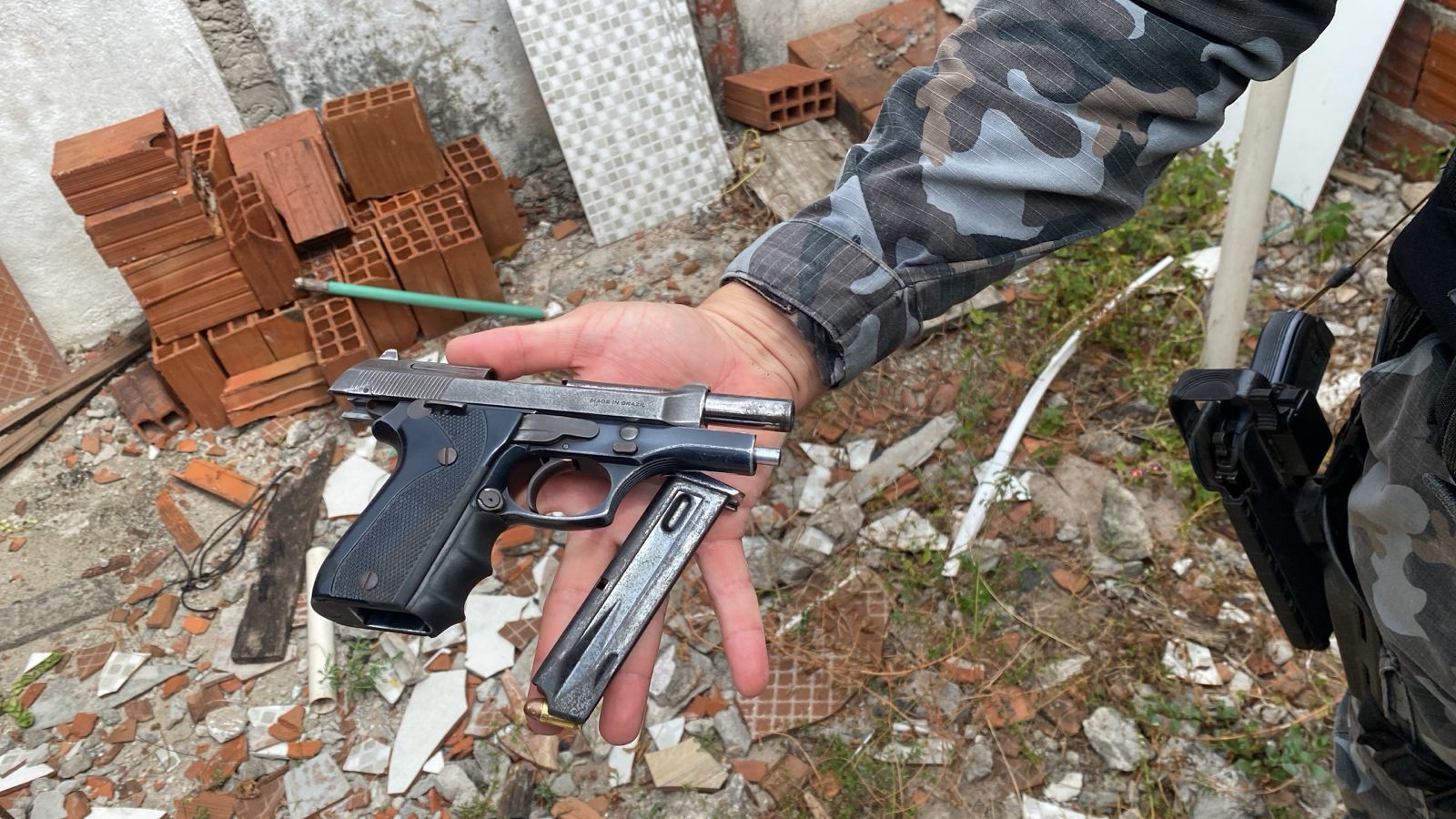 Ainda durante a ação, com apoio da Companhia de Policiamento com Cães (CPCães), do Batalhão de Operações Policiais Especiais (Bope), a PM localizou e apreendeu uma pistola do acusado que estava escondida no telhado da casa.