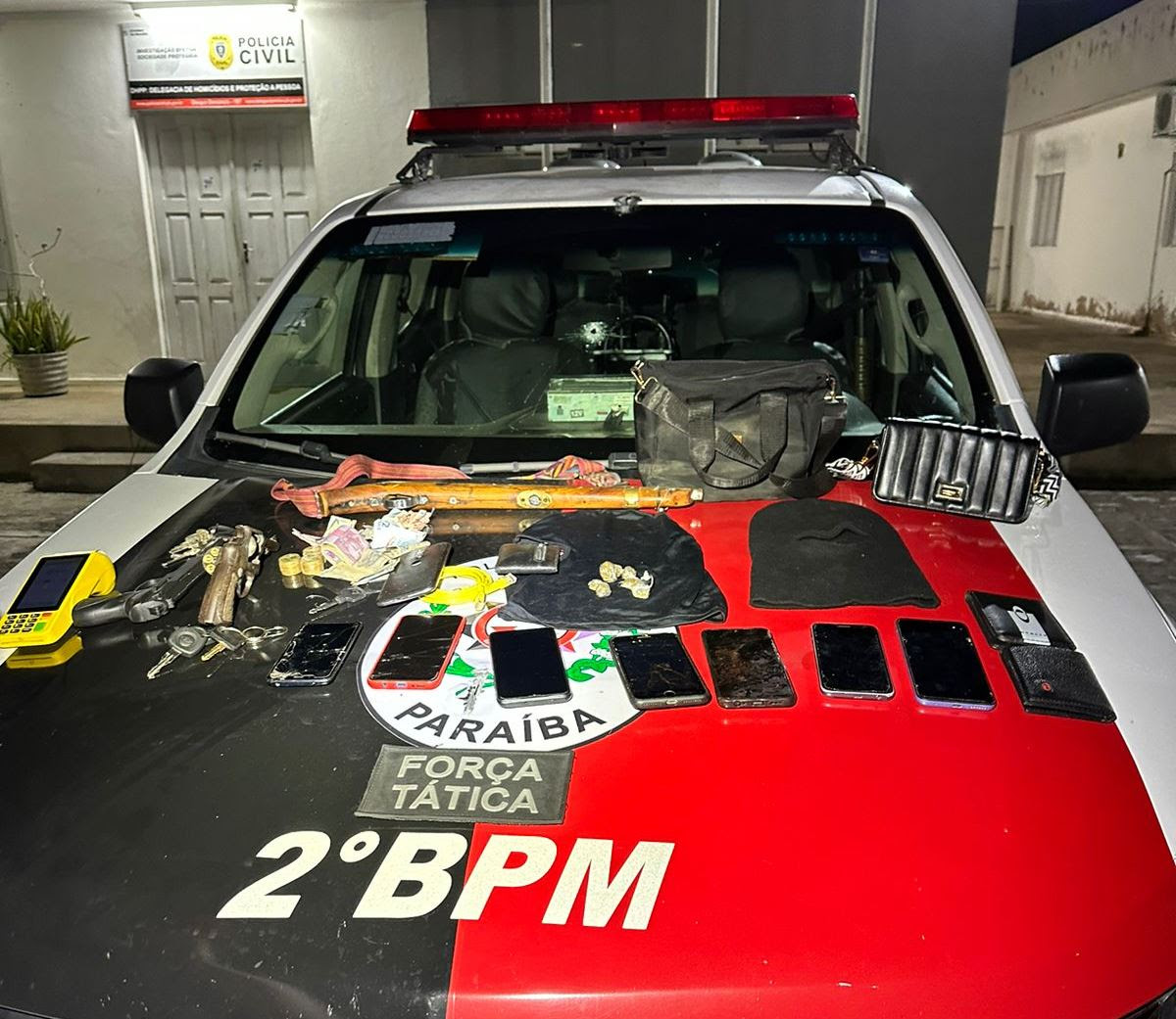 Ainda de acordo com o Batalhão, foram apreendidos com o grupo duas armas de fogo, sendo um revólver e uma espingarda, além de um simulacro de pistola, celulares, bolsas, toucas, máquina de cartão e várias porções de cocaína e maconha. Todos os cinco homens são maiores de idade e já foram reconhecidos por pelo menos 10 vítimas. A identificação oficial ainda será confirmada.