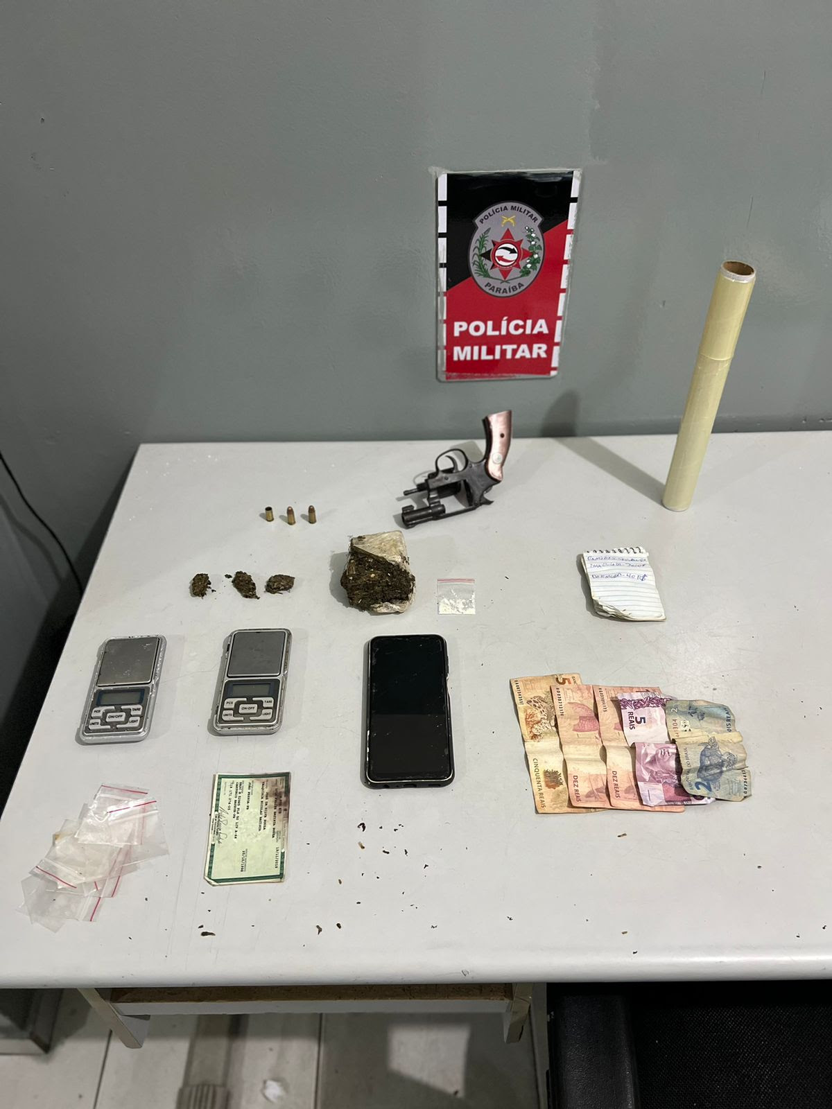 No acompanhamento dos policiais, o suspeito abandonou a motocicleta e entrou em uma residência, momento em que os policiais conseguiram capturá-lo e dar voz de prisão. Com ele foi apreendido um revólver, calibre 32, com três munições, sendo uma deflagrada; quatro porções de maconha; uma porção de cocaína, um celular; um caderno com anotações; duas balanças de precisão e certa quantia em dinheiro; caracterizando o tráfico de drogas.