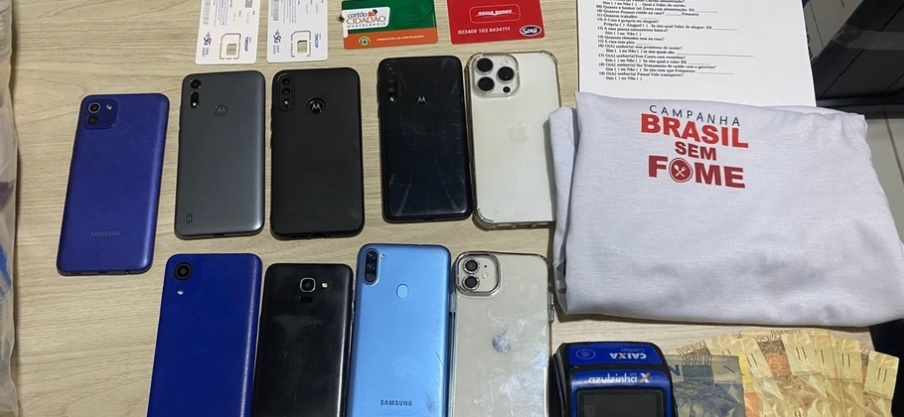 No carro, a polícia apreendeu cestas básicas, camisetas com a inscrição “Campanha Brasil sem Fome”, além de celulares, dinheiro e documentos utilizados na fraude. O veículo foi recolhido pela PRF por apresentar restrição administrativa de trânsito.