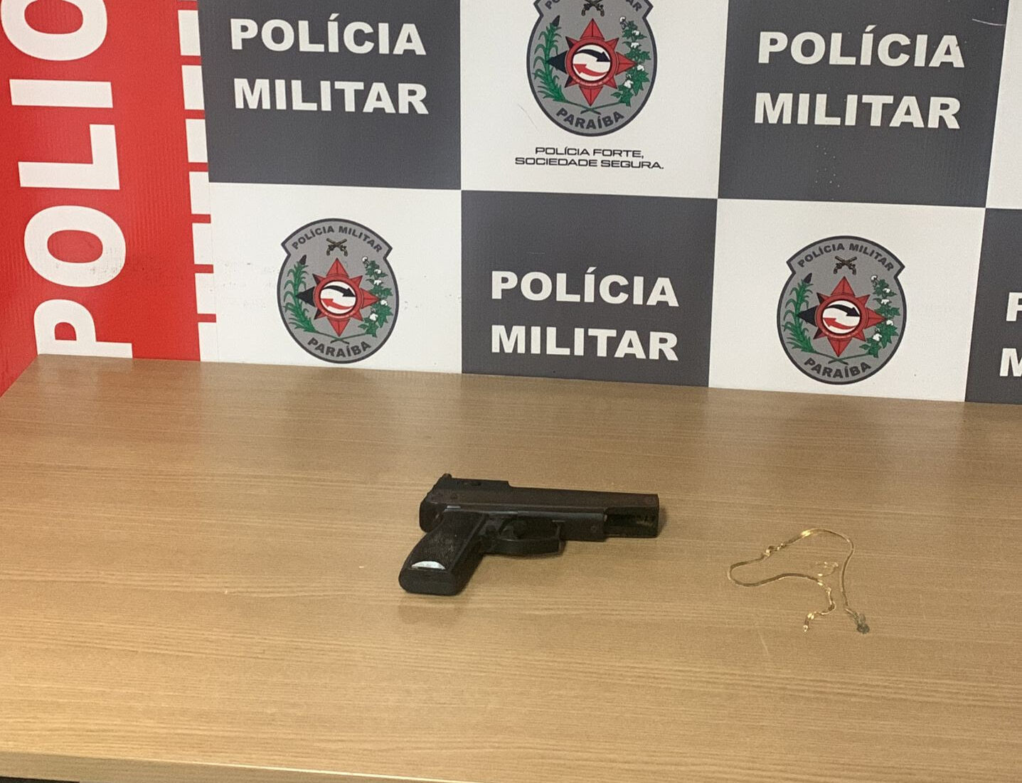 A equipe policial realizou diligências e conseguiu localizar os dois suspeitos, que foram detidos e com eles encontrado um simulacro de pistola, utilizado durante o roubo, além de pertences da vítima.