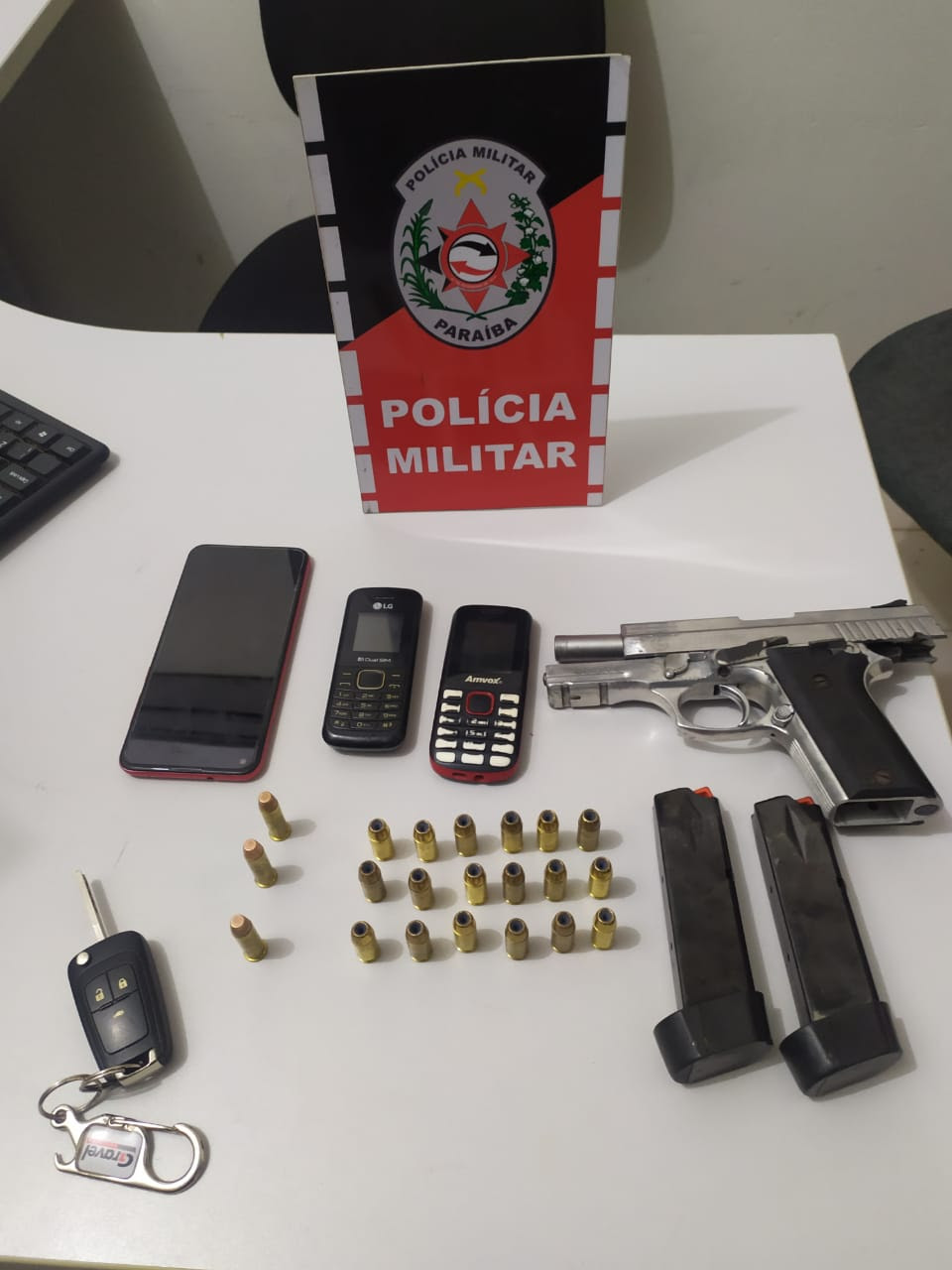 Após diligências, os policiais conseguiram localizar os quatro suspeitos e com eles foi apreendida uma pistola calibre .40, dois carregadores e munições do mesmo calibre.