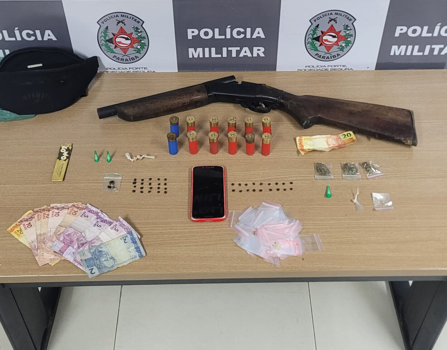 Durante rondas e abordagens naquela localidade, as equipes policiais se depararam com o suspeito e na abordagem encontraram uma espingarda, calibre 12, além de várias munições, dinheiro e porções de drogas.