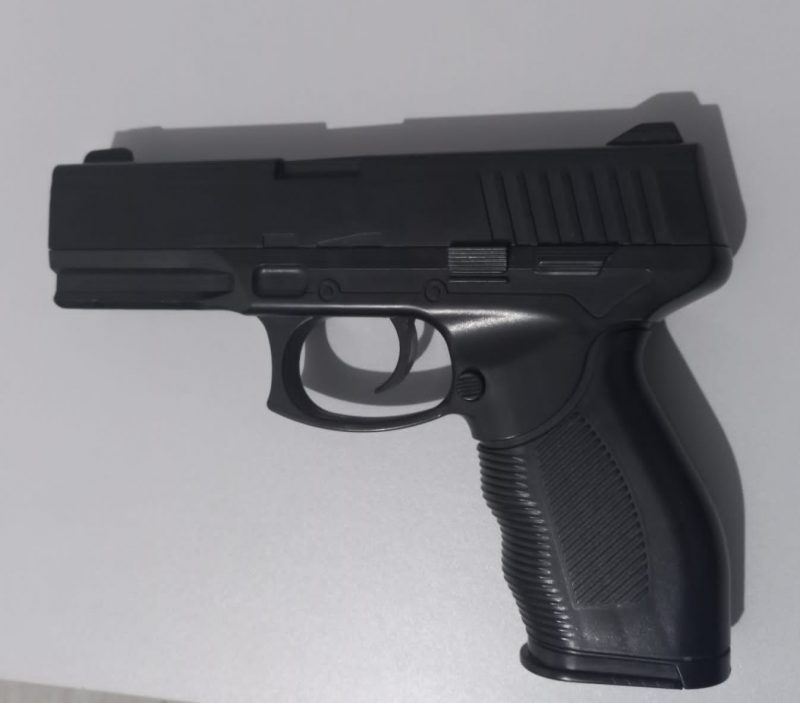 Durante a prisão do suspeito, a polícia apreendeu uma arma de brinquedo em sua cintura.
