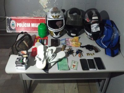 Os criminosos trocaram tiros com a PM, jogaram objetos roubados na estrada, mas foram detidos em um sítio. Como saldo da ação, os policiais apreenderam um revólver calibre 32, munições, recuperaram três veículos, sendo um caminhão de gás e duas motos, e apreenderam o carro usado na ação criminosa. Com a quadrilha, a PM encontrou também capacetes, objetos pessoais roubados como carteiras, documentos, mochilas, joias e quatro aparelhos celulares.