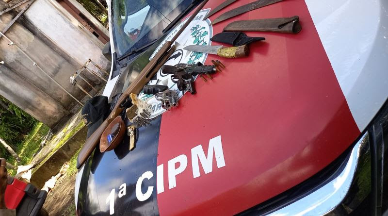 “Imediatamente, realizamos as buscas e conseguimos encontrar o agressor em uma propriedade rural, tentando se desfazer de alguns objetos ilícitos, algo que foi frustrado pela ação da PM. Ele estava com dois revólveres, munições, facões, canivetes, porções de drogas e até uma espingarda de pressão”, relatou o comandante. Ainda segundo o oficial, o preso já havia respondido na Justiça pelo crime de porte ilegal de arma de fogo.