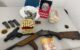 Na residência foram encontrados estojos de armas de fogo de calibre .38 e 9mm, além de uma escopeta calibre .12 com trinta cartuchos intactos, uma pistola Taurus modelo G2C 9mm com três carregadores e 25 munições intactas.