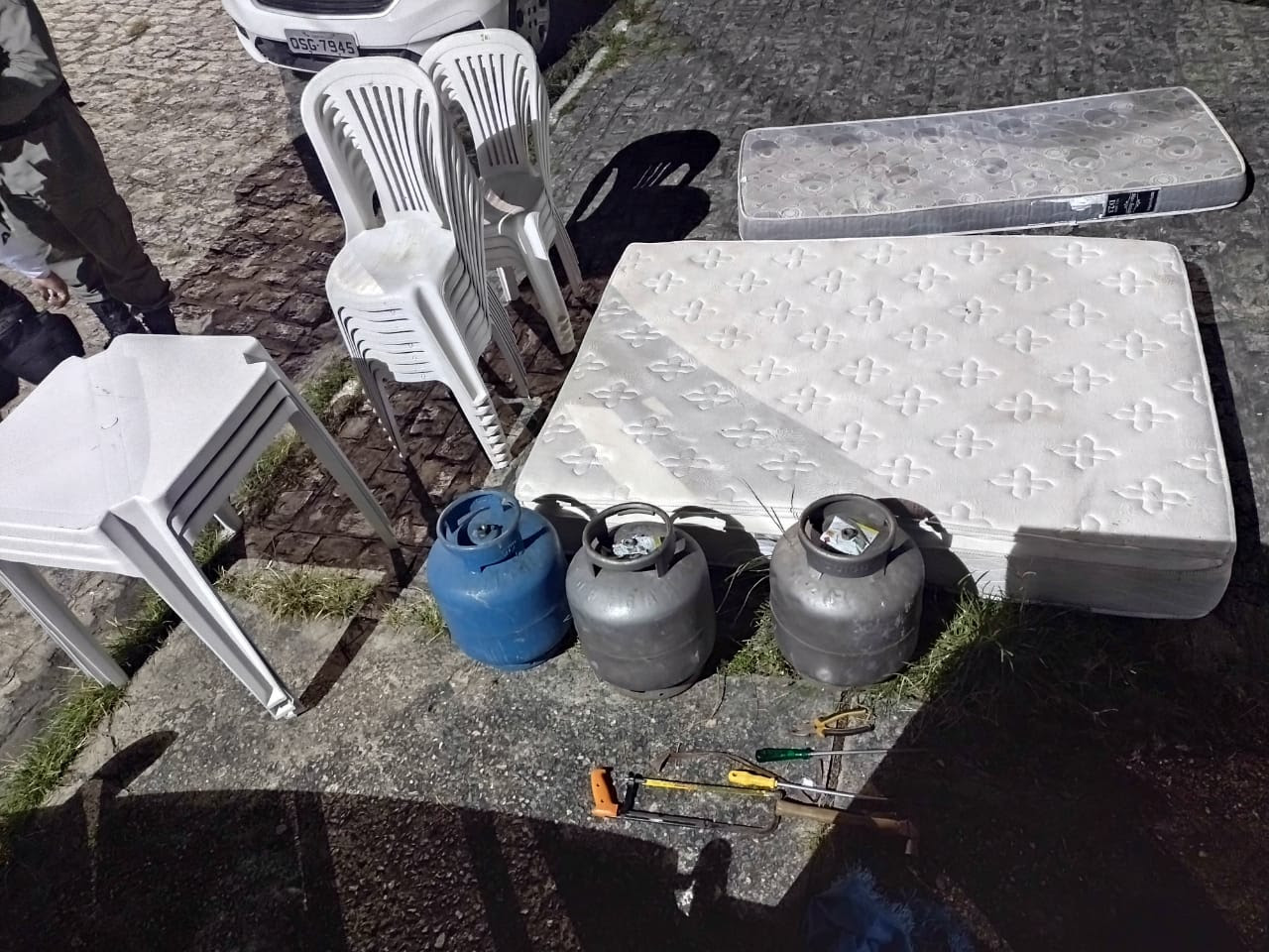 Com a dupla, foram recuperados colchões, geladeira, fogão, botijões de gás, mais de dez cadeiras, mesas e várias ferramentas. O carro usado para transportar o material furtado estava com as placas cobertas.