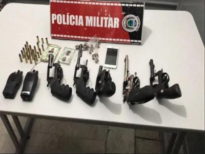 A equipe policial pediu apoio de outras guarnições, efetuando o cerco do quarteirão, e após uma varredura na localidade, conseguiram apreender cinco revólveres, 22 munições, algumas deflagradas, 13 trouxinhas de maconha, dois computadores, dois rádios de comunicação, além de deter dois homens, de 22 e 24 anos, que estavam escondidos em um quintal.