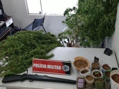 Informações levaram a polícia a uma residência apontada como de sendo de um dos suspeitos de ter participado da ação. Na casa, os policiais não encontraram ninguém, mas apreenderam 1 fuzil calibre 762, vários pés de maconha e uma moto com queixa de roubo ou furto junto ao Ciope.