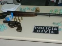 Maconha, cocaína duas espingadas calibre 12 e um revólver calibre 38 foram apreendidos. Uma balança de precisão também foi encontrada.