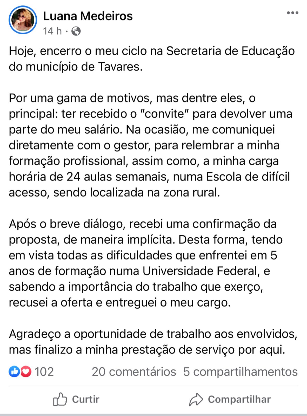 Por meio das suas redes sociais, uma educadora municipal da cidade de Tavares, no Alto Sertão da Paraíba, de nome Luanna Medeiros, denunciou que estaria havendo dentro da pasta da educação municipal uma tentativa de rachadinha no seu salário.