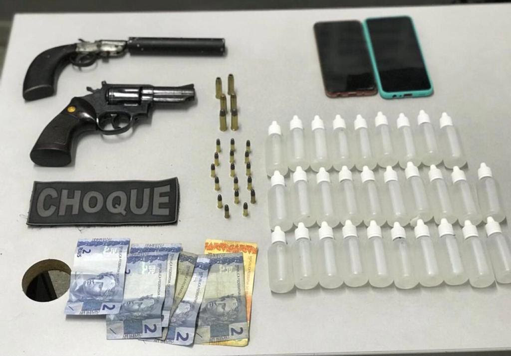 Policiais militares da 5ª Companhia de Policiamento de Choque do Batalhão de Operações Especiais (Bope) realizavam o patrulhamento tático móvel daquela região, quando perceberam um veículo com quatro homens em seu interior. Ao notarem a presença dos policiais, os suspeitos tentaram fugir da abordagem, mas foram detidos. A ação culminou na localização de 29 frascos de loló, apreensão de duas armas de fogo, sendo uma calibre 38 e outra calibre 22, 23 munições e na condução de quatro suspeitos à delegacia.