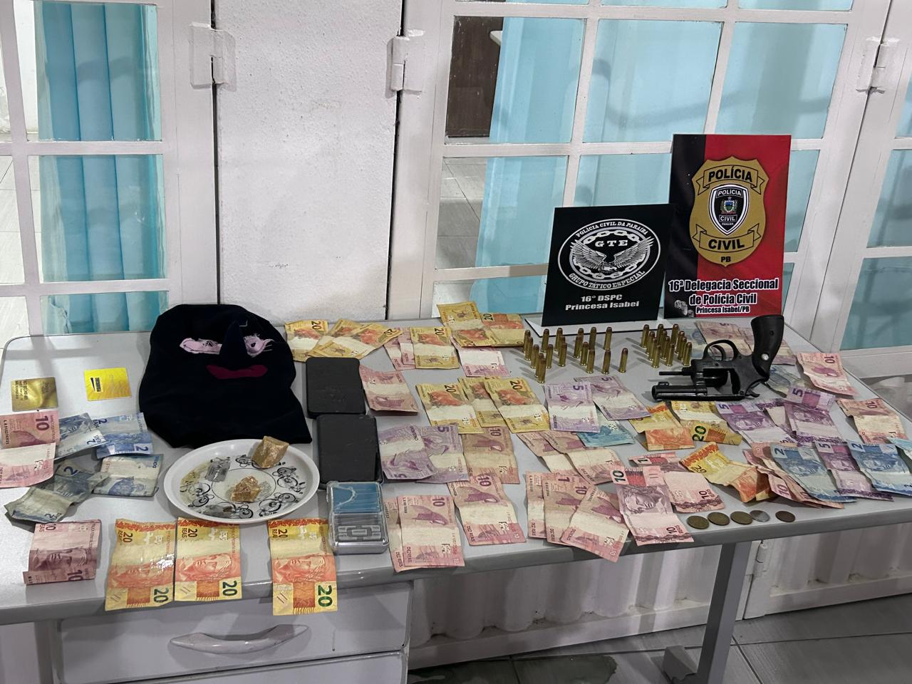 No local onde R.L.V. foi preso foram encontradas uma arma de fogo, munições e porções de crack. O material foi apreendido e será analisado pelo IPC da Polícia Civil.