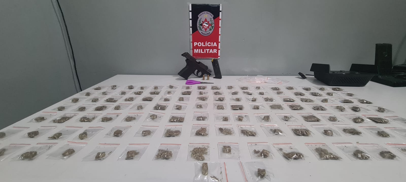 A Polícia Militar apreendeu uma pistola e 121 embalagens de maconha, na noite dessa terça-feira (9), em uma ação de combate ao tráfico, na comunidade Quatro Bocas, no distrito de Várzea Nova, em Santa Rita. O material estava com um suspeito de atuar na região. Ele foi preso em flagrante.