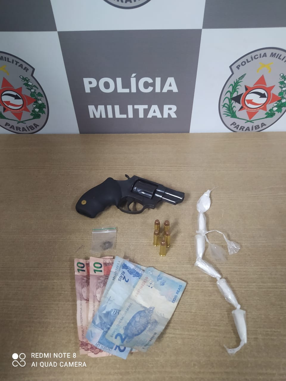 A Polícia Militar apreendeu um revólver, pinos de cocaína e dinheiro com um suspeito de 20 anos, durante rondas no condomínio Girassol, no bairro de Mangabeira. Ele já responde a três processos pelos crimes de homicídio, posse de drogas e porte ilegal de arma.
