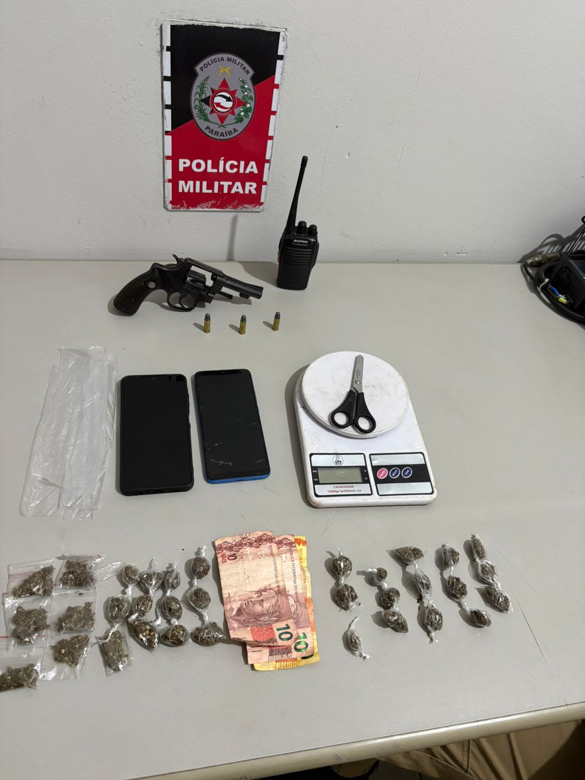Na ação, as equipes policiais estavam em rondas em uma área já conhecida pela prática do tráfico de drogas. As equipes visualizaram três homens que, ao perceberem a aproximação dos policiais fugiram e um deles sacou uma arma de fogo e a arremessou ao solo, mas todos foram alcançados e abordados. No local, foram encontrados um revólver calibre 38, com munições, 33 sacolés de maconha, uma balança de precisão, um rádio comunicador e dinheiro.