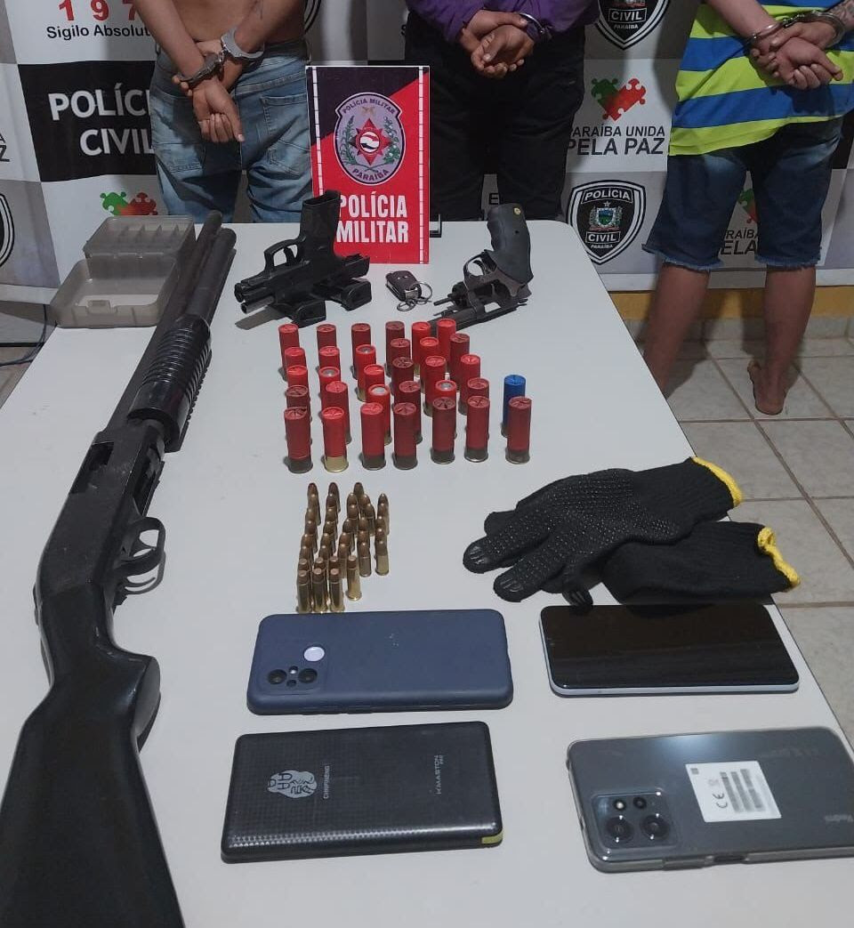 A Polícia Militar prendeu três homens que estavam armados com uma pistola, um revólver, uma espingarda e quase 70 munições, na noite dessa terça-feira (8), dentro de um motel, na cidade de Catolé do Rocha. Eles são suspeitos de atirar em via pública, no bairro Tancredo Neves.