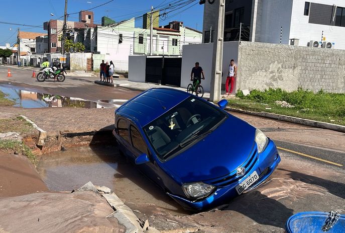 Um veículo caiu na manhã de hoje (08), em uma cratera que se abriu após um grande vazamento de água ser registrado na avenida Campos Sales, no bairro do Bessa, em João Pessoa.