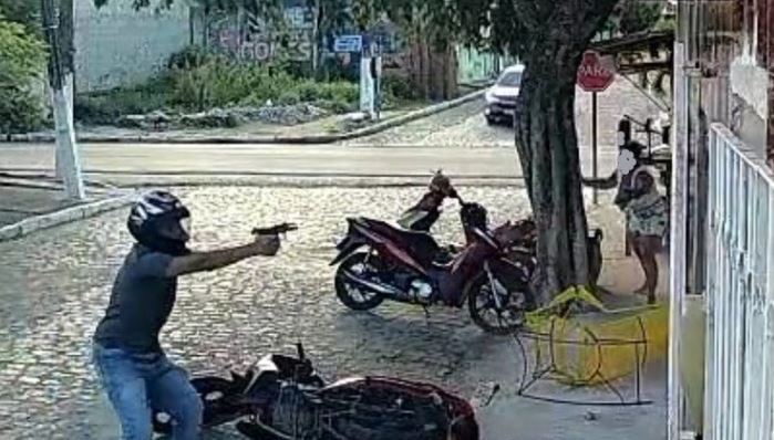Segundo informações da polícia a ocorrência teria acontecido na última quarta-feira (26). Nas imagens, é possível ver que dois homens, uma mulher e a criança conversam na calçada de uma residência quando dois homens em uma moto entram na rua.