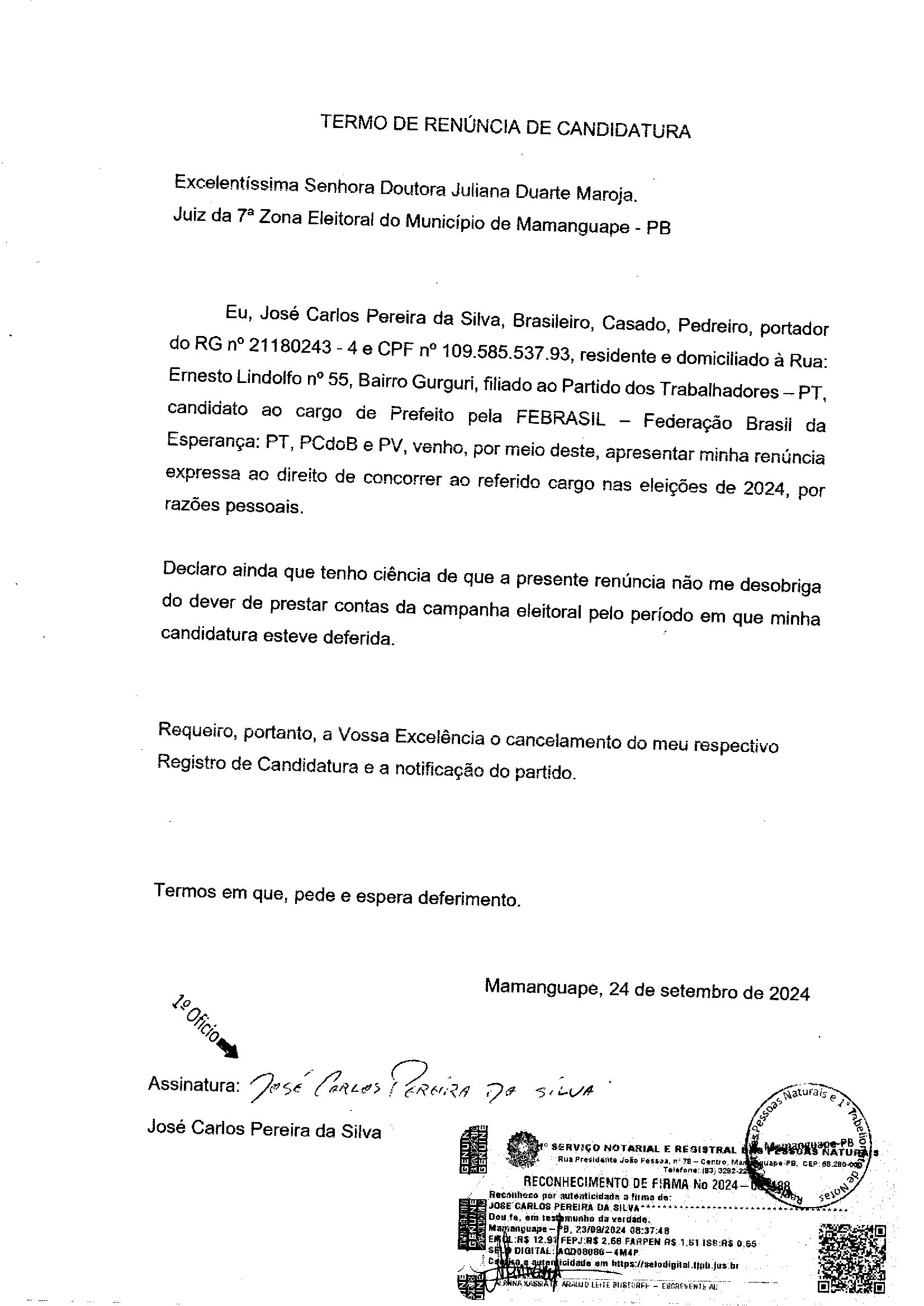 José Carlos Pereira da Silva, conhecido como Vinho do PT, retirou sua candidatura à Prefeitura de Mamanguape, restando apenas 11 dias para o pleito municipal. A informação foi confirmada nesta quarta-feira (25) através do portal de Divulgação de Candidaturas e Contas Eleitorais (DivulgaCandContas) do Tribunal Superior Eleitoral (TSE).