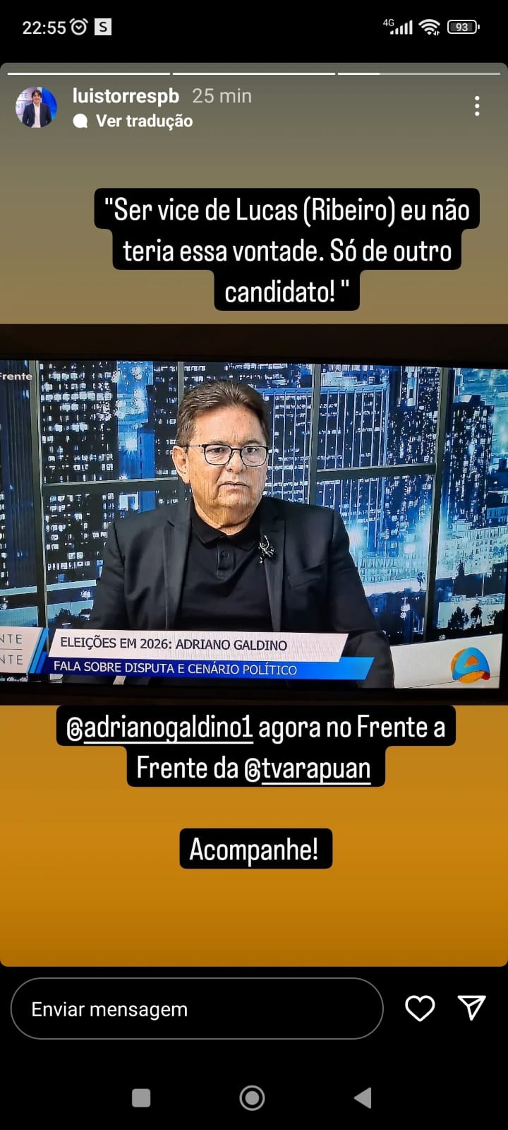 “Ser vice de Lucas Ribeiro eu não teria essa vontade. Só de outro candidato”, disse Adriano Galdino no programa Frente a Frente apresentado por Luiz Torres.