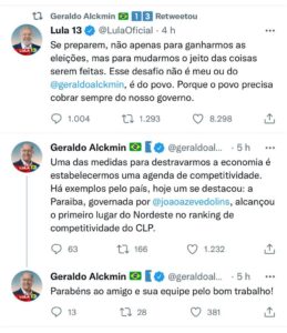 “Uma das medidas para destravarmos a economia é estabelecermos uma agenda de competitividade. Há exemplos pelo país, hoje um se destacou: a Paraíba, governada por João Azevêdo, alcançou o primeiro lugar do Nordeste no Ranking de Competitividade do CLP. Parabéns ao amigo [João Azevêdo] e sua equipe pelo bom trabalho!”, comentou Alckmin ao compartilhar também no Twitter a postagem de Lula.