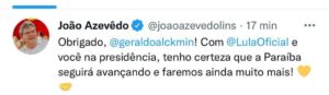 João agradeceu os elogios e projetou mais avanços para a Paraíba com Alckmin e Lula na Presidência da República a partir de 2023. “Obrigado, Geraldo Alckmin! Com Lula e você na presidência, tenho certeza que a Paraíba seguirá avançando e faremos ainda muito mais!”