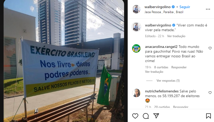 O deputado estadual reeleito bolsonarista Wallber Virgolino (PL) defendeu, em postagem publicada no seu Instagram, uma intervenção militar no Brasil por não aceitar o resultado da eleição, que deu vitória a Luiz Inácio Lula da Silva (PT) em detrimento do atual presidente Jair Bolsonaro (PL).