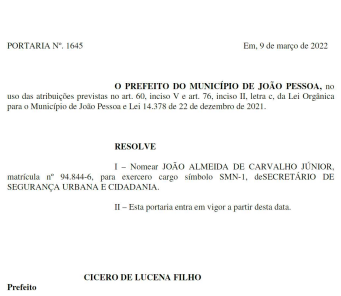 Já ontem, quarta-feira (9), o Semanário Oficial da Prefeitura de João Pessoa publicou portaria de nomeação de João Almeida para o retorno à secretaria de Segurança Pública Municipal.
