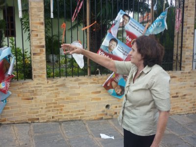 Ao chegar do lado de fora, ela viu militantes que saíram da carreata para rasgar e derrubar, faixas, cartazes e banners do candidato do PMDB, José Maranhão, que estavam postos nas grades do portão, em frente a sua casa. Ela disse que quando eles a viram começaram os xingamentos com palavras de baixo calão, mandando, inclusive que ela aprendesse a votar e que o certo era Ricardo Coutinho (PSB).