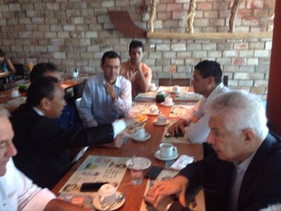 O deputado federal está conversando num café da manhã amistoso com vários políticos como Luiz Couto, o secretário Adalberto Fulgêncio, o prefeito Luciano Cartaxo (PT), Charliton Machado, presidente do PT na Paraíba, Rômulo Gouveia (PSD), presidento do PSD na Paraíba, Damião Feliciano (PDT), entre outros políticos de outros estados.