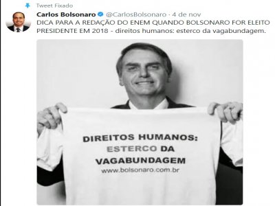 O vereador carioca Carlos Bolsonaro (PSC), filho do deputado Jair Bolsonaro (PSC-RJ), publicou no Twitter uma foto em que seu pai segura um cartaz com a seguinte frase: “Direitos humanos, esterco da vagabundagem”. A imagem faz referência a um tuíte com o mesmo teor escrito pelo deputado em 16 de agosto de 2016.