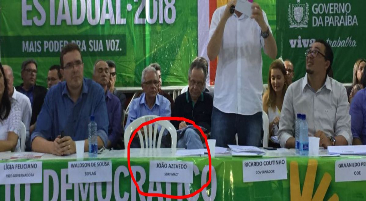 A cadeira antes ocupada pelo secretário de Estado da Infraestrutura da Paraíba, João Azevêdo, ficou vazia durante plenária do Orçamento Democrático Estadual na noite desta sexta-feira (23), em Campina Grande. Mesmo com a ausência do pré-candidato do PSB, o cerimonial do evento fez questão de colocar o espaço antes ocupado por João.