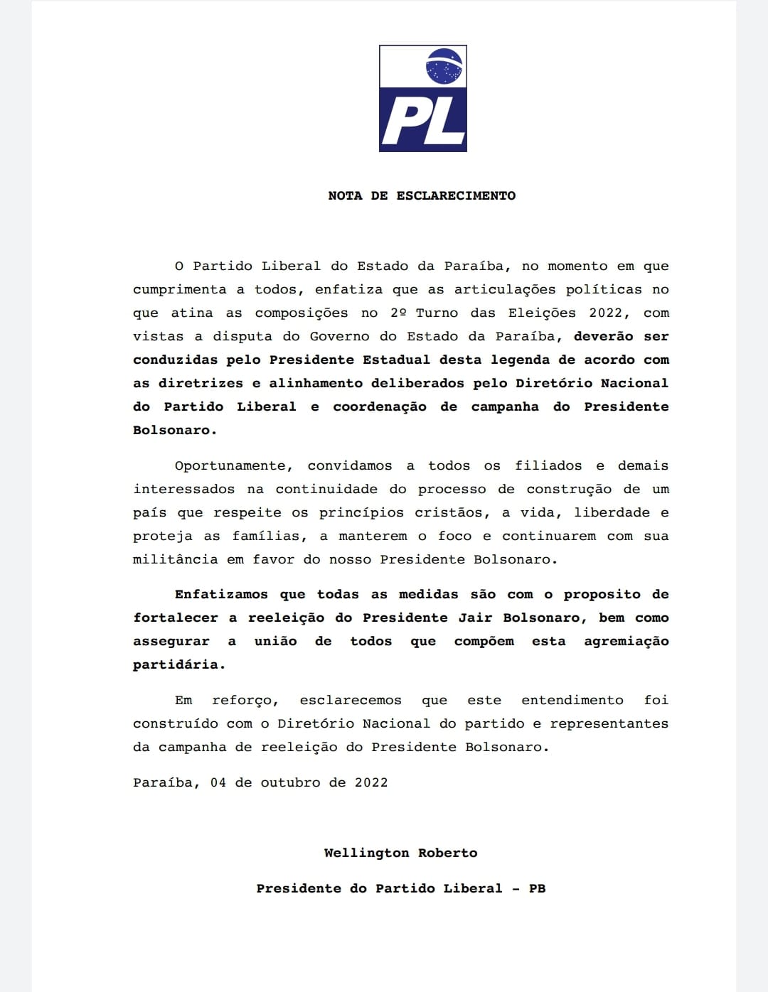 Sobre o posicionamento do PL, partido do presidente Jair Bolsonaro, a Executiva Estadual do Partido Liberal (PL) emitiu ontem (4), uma nota oficial, que as articulações visando as alianças de segundo turno, na Paraíba, serão conduzidas pelo presidente estadual do partido, deputado federal Wellington Roberto. A nota do partido com a deliberação é assinada pelo próprio parlamentar.