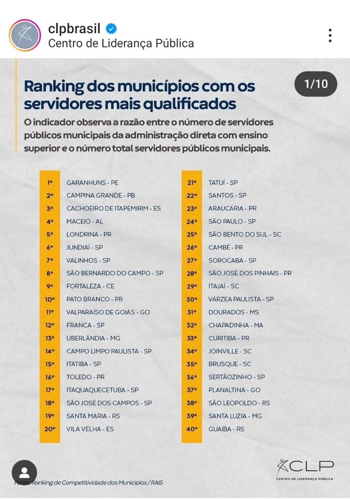 Acima de Campina Grande, está apensas o município de Garanhuns, em Pernambuco. Por uma limitação do Instagram, a tabela não contempla as últimas 10 posições do Ranking.