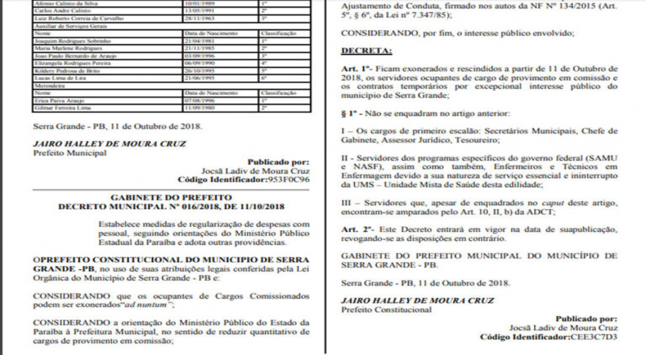 Segundo o gestor, a decisão, divulgada hoje no Diário Oficial dos Municípios da Paraíba atende a uma determinação do Ministério Público da Paraíba no sentido de reduzir quantitativo de cargos de provimento em comissão. Também foi alegado que a Prefeitura Serra Grande encontra-se “próximo do índice prudencial no que toca a Gestão de Pessoal prevista na Lei de Responsabilidade Fiscal”. Confira a decisão aqui.