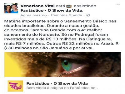 O Deputado Federal Veneziano Vital do Rêgo usou suas mídias sociais para comentar a matéria principal da revista eletrônica “Fantástico da Rede Globo” que trouxe como destaque o relatório do Instituto Trata Brasil, o sobre Saneamento Básico nas 100 maiores cidades do país. No post o deputado lembra que na sua gestão a frente da prefeitura de Campina Grande a cidade chegou a 4ª melhor posição no Nordeste.