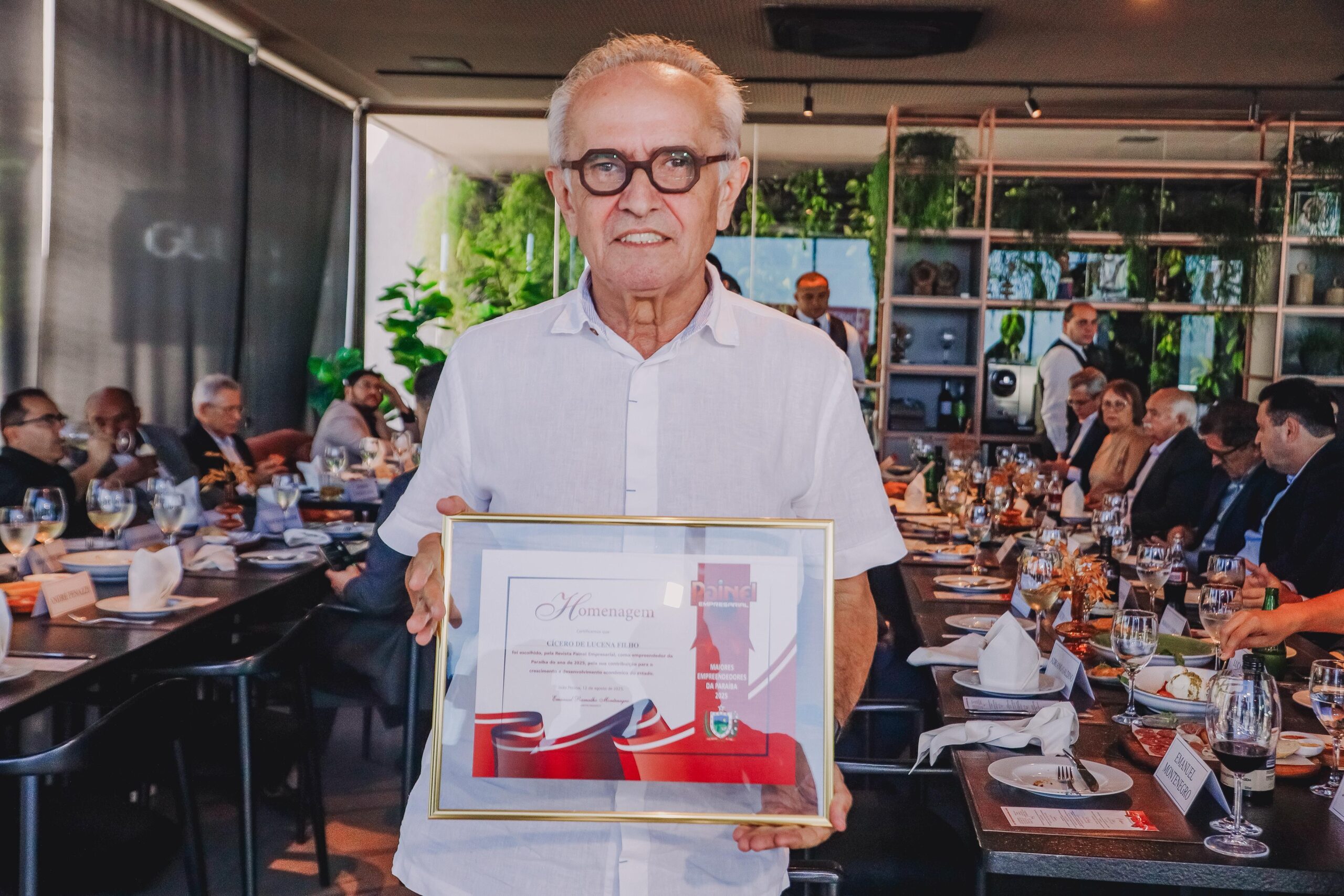O prefeito Cícero Lucena foi homenageado com o certificado de maior empreendedor da Paraíba do ano de 2025, em premiação promovida pela Revista Painel Empresarial, que destacou os 20 maiores contribuintes para o desenvolvimento econômico do Estado. A solenidade aconteceu na tarde desta terça-feira (12), em um restaurante da Orla da Capital, e também contou com a presença do governador João Azevêdo e de outros 18 empresários homenageados.