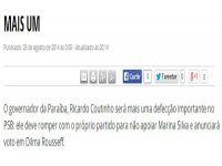 “O governador da Paraíba, Ricardo Coutinho será mais uma defecção importante no PSB: ele deve romper com o próprio partido para não apoiar Marina Silva e anunciará voto em Dilma Rousseff”, disse Cláudio Humberto.